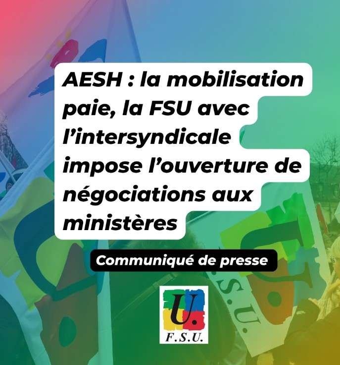 AESH : la mobilisation paie ! La FSU avec l’intersyndicale impose l’ouverture de négociations aux ministères Depuis le printemps 2025, les AESH se mobilisent dans un cadre intersyndical pour faire entendre leurs revendications. Journées d’action répétées, initiatives collectives, pétition massive ayant franchi les 100 000 signatures : la dynamique a largement dépassé le cadre professionnel. Parents d’élèves, associations et parlementaires se sont à leur tour engagé.es, réclamant la création [...]