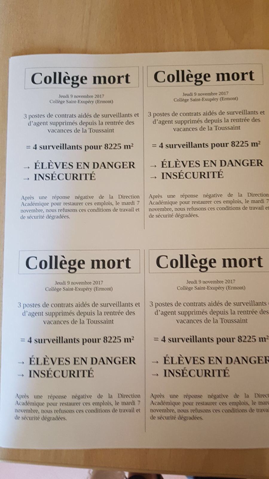 Un autre poste à été supprimé, un poste d’agent en CUI également. C’est problématique ! Un collège moins bien entretenu est un collège moins accueillant pour les élèves !