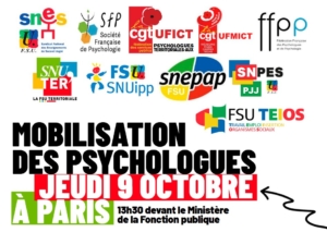 L’intersyndicale, interassociative des psychologues de la CGT, de la FSU, de la SFP (Société Française de Psychologie) et de la FFPP (Fédération Française des Psychologues et de Psychologie) a décidé d’appeler les psychologues à l’action sur la situation d’urgence dans les services publics, le manque criant de recrutements, le pouvoir d’achat mais aussi les attaques sur les missions et les statuts : Tous·tes les psychologues des secteurs de la santé, de l’Éducation nationale, du travail, de la PJJ, des collectivités territoriales et de l’administration pénitentiaire sont attendu·es ce jeudi 9 octobre 2025, à 13h30 devant le ministère de la fonction publique.